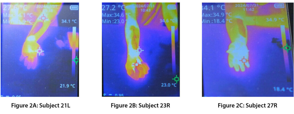 Figure 2: Sample thermal images of skin temperature changes from test areas (dark areas on forearm indicate cooled skin)