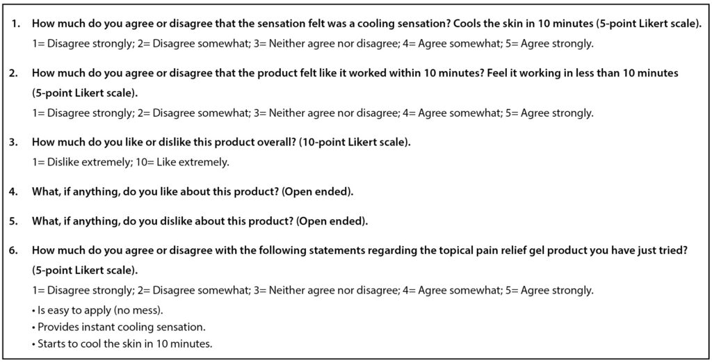 Phase 2 evaluated subjective skin cooling perception. This was conducted immediately post objective measurements after a wash-out period during which subjects washed their hands and forearm in cold water and then immediately applied 1g of the pain relief gel to their non-dominant forearm (i.e. opposite forearm to the test forearm in Phase 1 of the study) for 3 seconds. As subjects applied the product to their skin as they would with real-life use and were free to apply as they would normally, a larger quantity of product was provided in this subjective phase, versus the objective phase (1g versus 0.5g) to ensure reasonable skin coverage in line with real-life consumer use. Subjects were asked to record time to a perceived cooling sensation. They subsequently completed a questionnaire (see Table 1) on fast-acting cooling sensation, overall liking of product and agreement with product-related statements on 5-point and 10-point Likert scales. Subjects washed their hands and arm in cold water once the questionnaire was complete. The total study duration for each participant was 60 minutes. Statistical analysis considering both long-lasting and fast-acting data was via 2-tailed t tests performed at both 90% and 95% confidence to identify any significant differences between subgroups. The study was approved by the Reading Independent Ethics Committee.