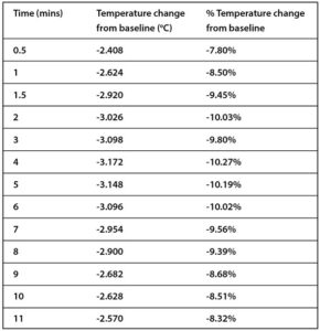 The average baseline skin surface temperature among subjects was 30.88°C. The pain relief gel reduced skin surface temperature from baseline temperature with reduction detected at the first recording at 30 seconds and at each time point interval (see Table 2). The peak average temperature drop of -3.172°C (10.27%) occurred at 4 minutes, p=0.05 (see Table 2 and Figure 1).